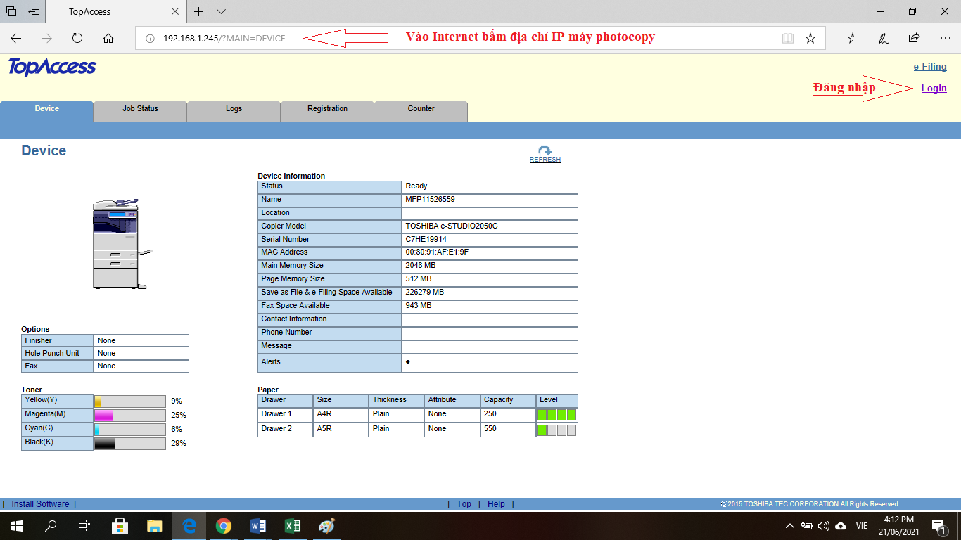 Bước 1: Bạn nên sử dụng trình duyệt Enternet Explorer gõ địa IP máy photocopy